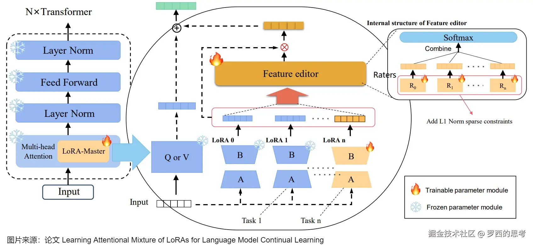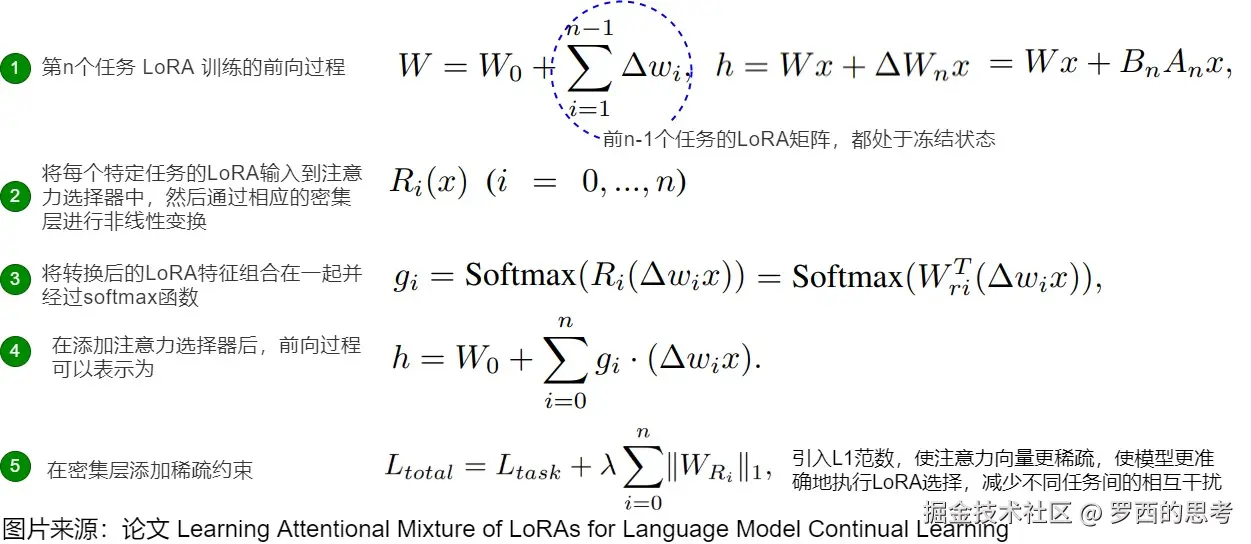 - 基于集成的工作维护和组合多个特定任务的 LoRA 模块。CoLoR 为每个任务维护单独的 LoRA 模块,并在推理时使用无监督方法选择适当的模块。CoLoR 顺序训练特定任务的 LoRA 模块,并使用基于原型的任务识别将它们组合起来。这允许隔离任务知识,同时实现灵活组合。AM-LoRA使用多个特定任务的 LoRA 模块与注意力机制相结合,集成来自不同任务的知识。AM-LoRA的关键在于设计了一个注意力机制作为知识混合模块,以适应地集成每个LoRA的信息。通过注意力机制,AM-LoRA可以有效利用每个LoRA的独特贡献,同时减轻它们之间可能导致的灾难性遗忘的风险。此外,AM-LoRA在学习过程中进一步引入了范数,使注意力向量更加稀疏。稀疏约束可以使模型倾向于选择少数高度相关的LoRA,而不是集体聚合和加权所有LoRA,这可以进一步减少来自相互干扰的影响。