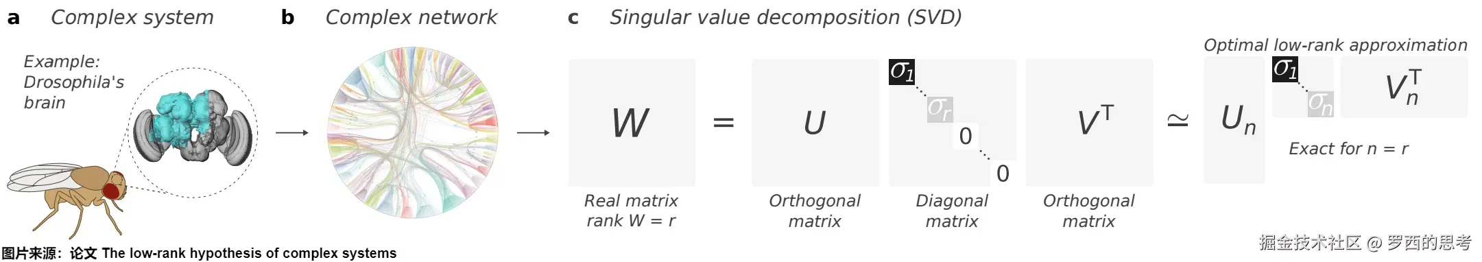由于网络总是可以用矩阵和张量的语言来描述,线性代数为研究网络属性提供了重要的工具。SVD分解(Singular Value Decomposition / 奇异值分解)是线性代数的一个矩阵分解技术。SVD 的作用在于将矩阵分解为若干个不同重要性的分量之和。奇异值分解常用于降维和压缩,通过保留较大的奇异值,可以近似表示原始矩阵。