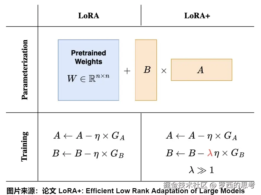 LoRA+: Hayou, S., Ghosh, N., & Yu, B. (2024). LoRA+: Efficient Low Rank Adaptation of Large Models. v preprint arXiv:2402.12354.
