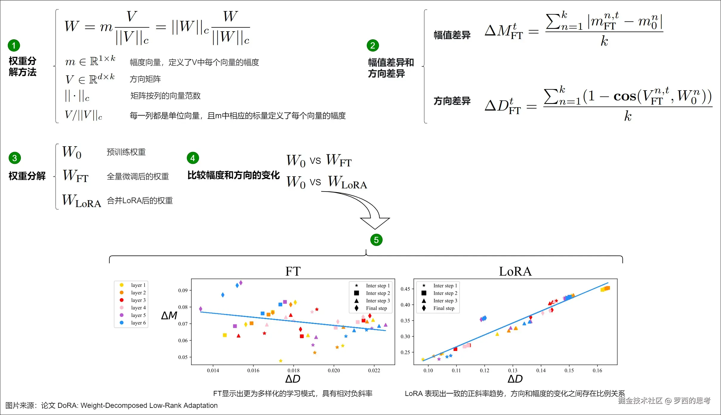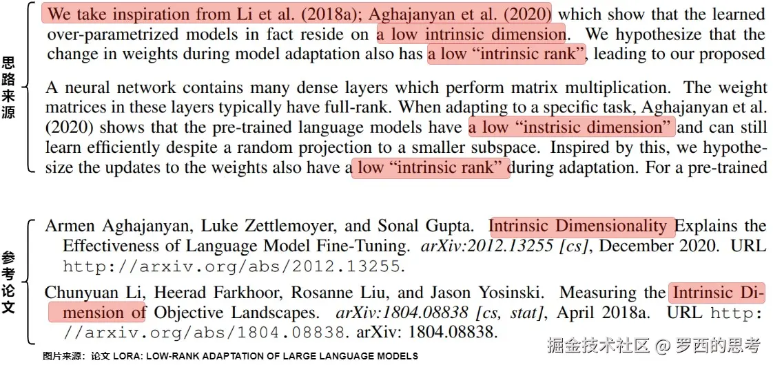 - LoRA的低秩假设,即模型的finetune过程往往在低秩的子空间中进行更新。所以LoRA的矩阵参数,不仅代表了对原始模型的数值更新,也捕获了模型参数的更新方向。