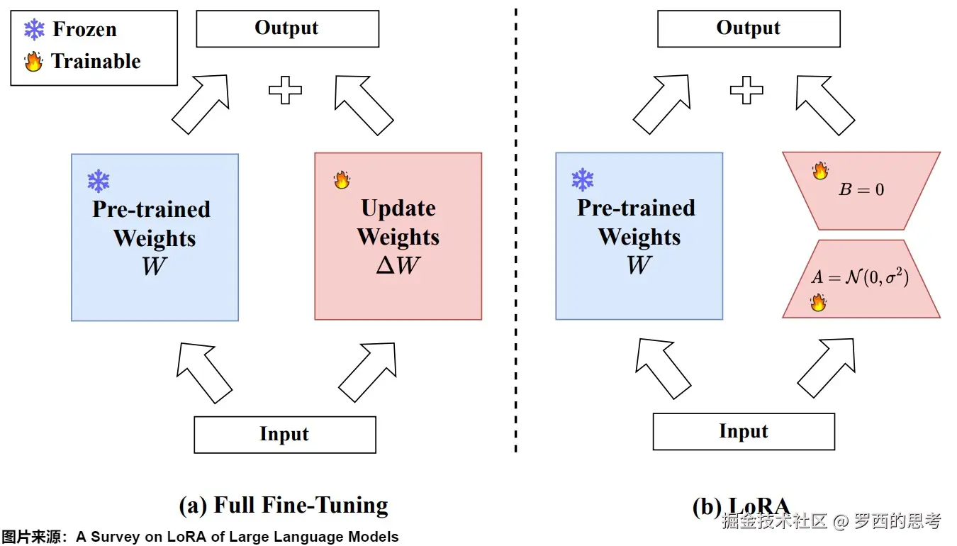 下图展示了全量微调和LoRA的区别。B和A的维度分别为d×r和r×d,其中r远小于d,d是原始权重矩阵的维度。因此,微调的参数量从原来的d×d减少到了2×r×d,显著降低了参数量和计算成本。
