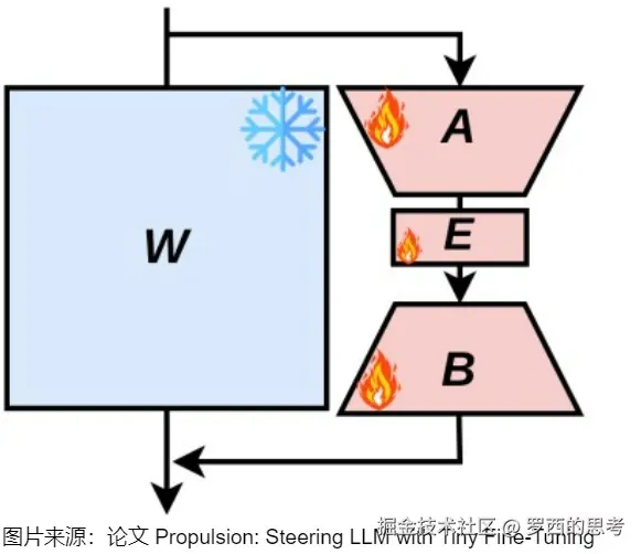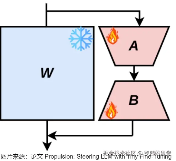比如,我们并不使用来更新W,而是将其保存为单独的模型,并在推理阶段再进行更新,这样我们就可以针对不同的任务,来微调模型,形成针对任务的。也就是: