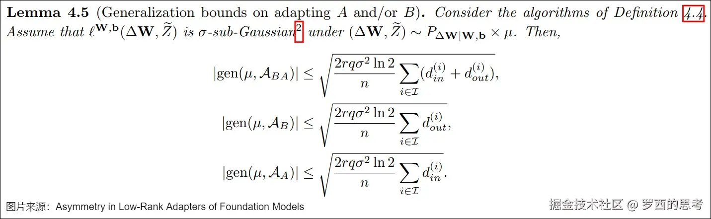 论文"Asymmetry in Low-Rank Adapters of Foundation Models"给出了不同LoRA变体的泛化界限( generalization bound)。下图中分别是更新BA,只更新A,只更新B的泛化界限。其中 r 是秩,q 是量化位, 与损失的次高斯性( sub-Gaussianity)相关,n 是样本大小,分别是第 i 层的输入、输出维度。可以看到,只更新B与更新A和B两者相比,该界限更紧,这表明将A冻结为随机正交矩阵并且仅更新B,可能会潜在地增强对未见过数据的泛化能力。