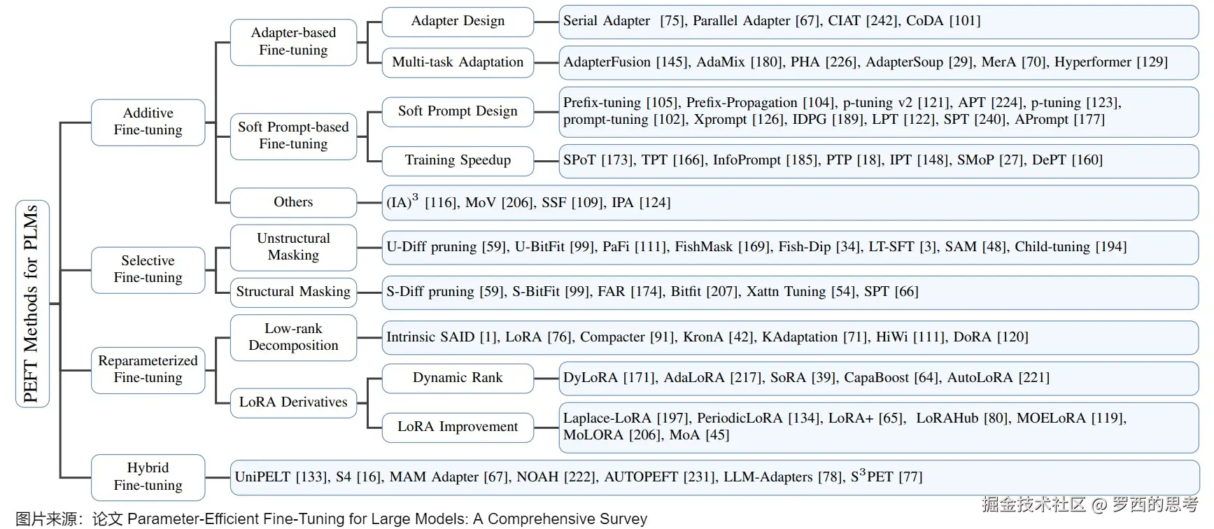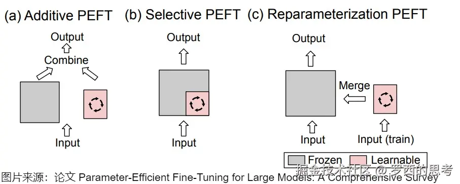 PEFT的分类方法没有统一的规范,这里采用论文"Parameter-Efficient Fine-Tuning for Large Models: A Comprehensive Survey"的说法,将PEFT策略可大致分为四类: