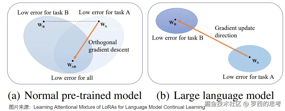 然而,在巨大的参数空间的LLM中,多个任务的最优参数可能非常不同,甚至不存在共同最优解。在这种情况下学习新任务时,模型参数与前一个任务的匹配程度将更低,导致灾难性遗忘。即使参数收敛到共同最优解,模型也会逐渐偏离前一个任务的最优参数,导致当前参数与前一个任务参数的不匹配问题。另外,O-LoRA也限制了模型捕捉跨任务异质性的能力,从而影响了后续任务的学习。具体参见下图(b)。