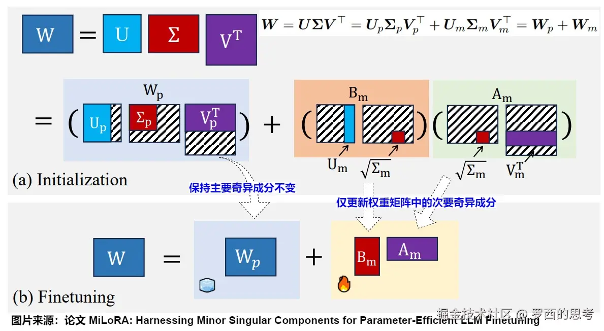 与PiSSA相反,MiLoRA(Minor singular component based Low Rank Adaptation)使用次要的奇异值和奇异向量进行初始化。考虑到低秩矩阵的随机初始化可能干扰预训练矩阵中已学习的重要特征,MiLoRA通过减少这种干扰来提高整体性能,同时适应新任务。而PISSA主要保留奇异值进行更新。