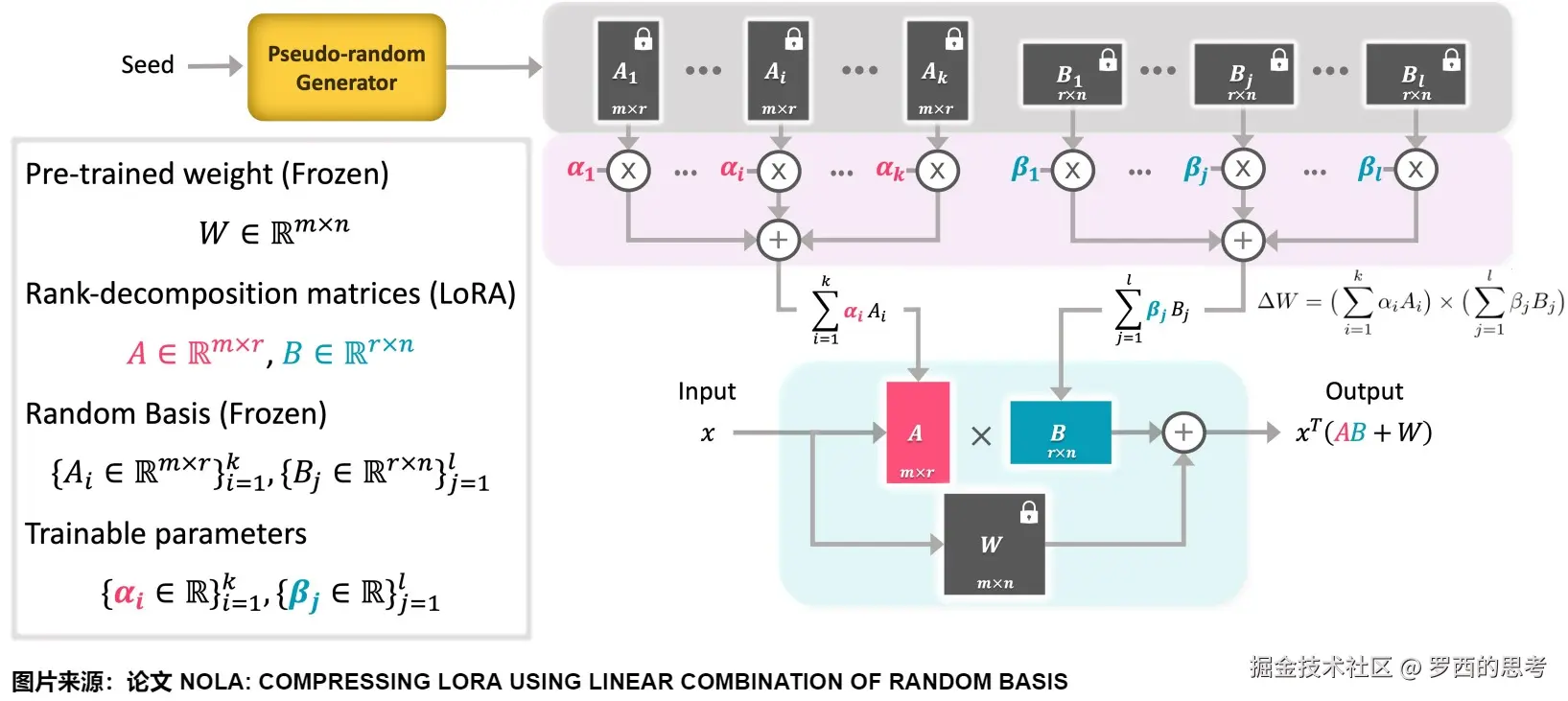 - 把增量矩阵分解为两个低秩矩阵A和B。用A和B这两个矩阵的乘法来低秩近似。即。