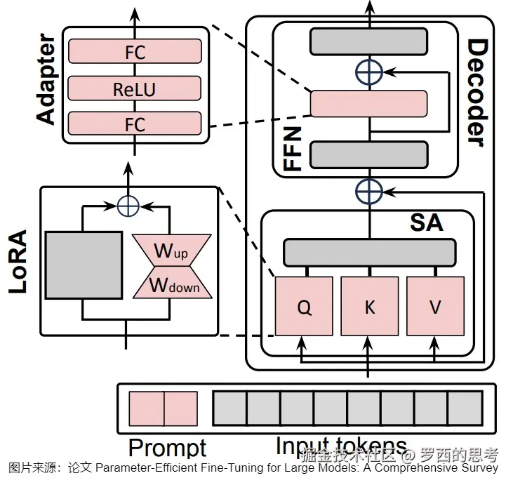 另外,上述的PEFT方法中,有些是可以混用的。比如下图中,所有可学习的组件是红色的,冻结的组件是灰色的。LoRA被应用到Q,K和V上,adapter 被用用到FFN上。Soft-Prompt则对每个解码器的输入激活进行调节。