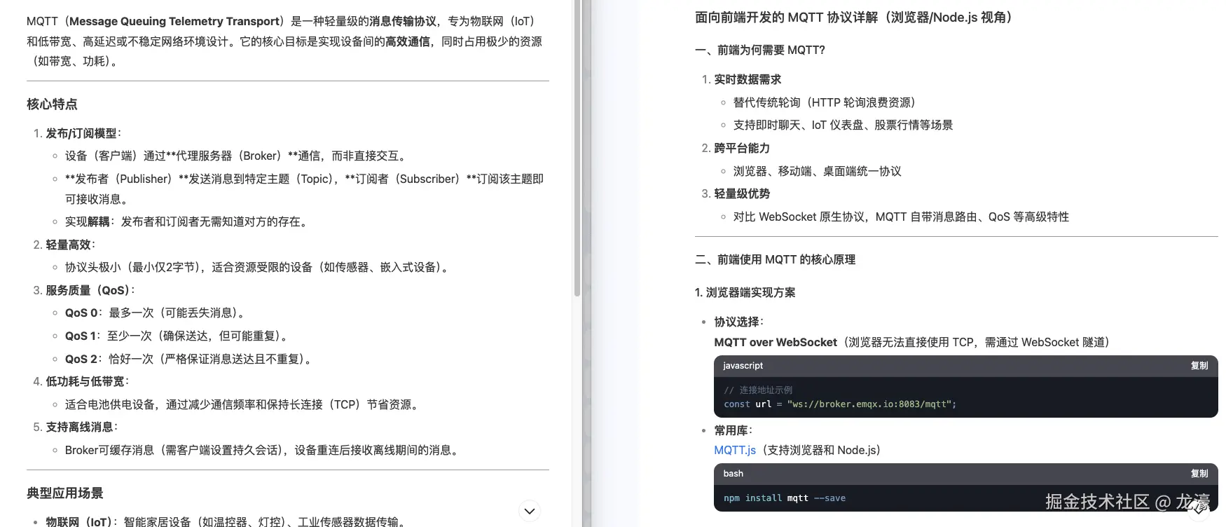 ➡️ 作为一个前端开发者我需要了解 MQTT,阐述 MQTT 协议的详细原理和作用,并且列举出详细的例子说明。