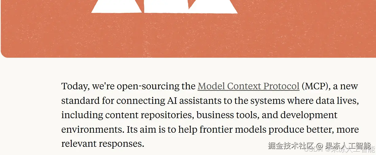 它是一个开源协议,标准化了 AI 助手如何连接到数据所在的系统,比如内容仓库、业务工具和开发环境。