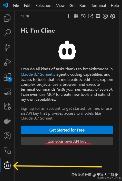 - 输入一个 API key(比如来自 OpenRouter)来让 Cline 运行。