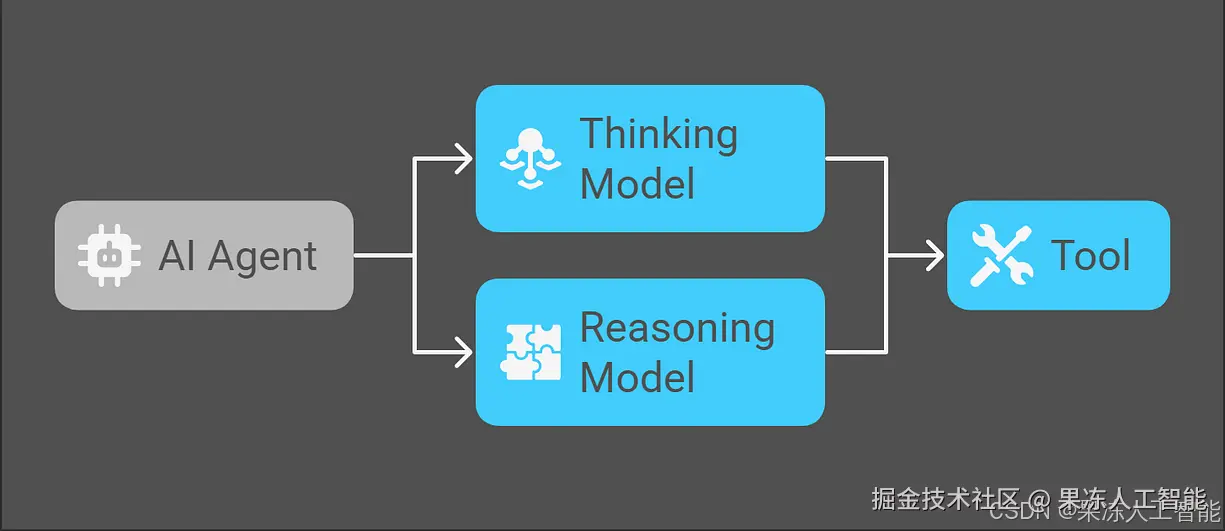 在幕后,一个 AI 智能体有一个思考模型和一个推理模型,它们和某个工具连接起来。