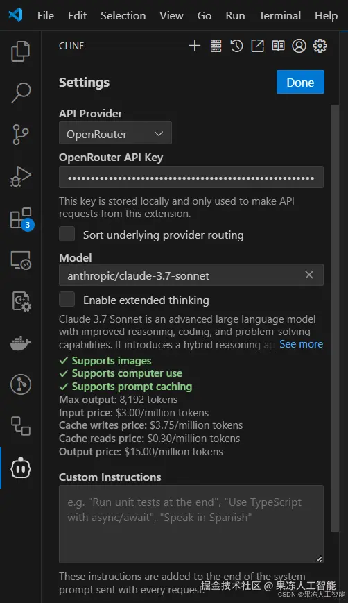 - 输入一个 API key(比如来自 OpenRouter)来让 Cline 运行。