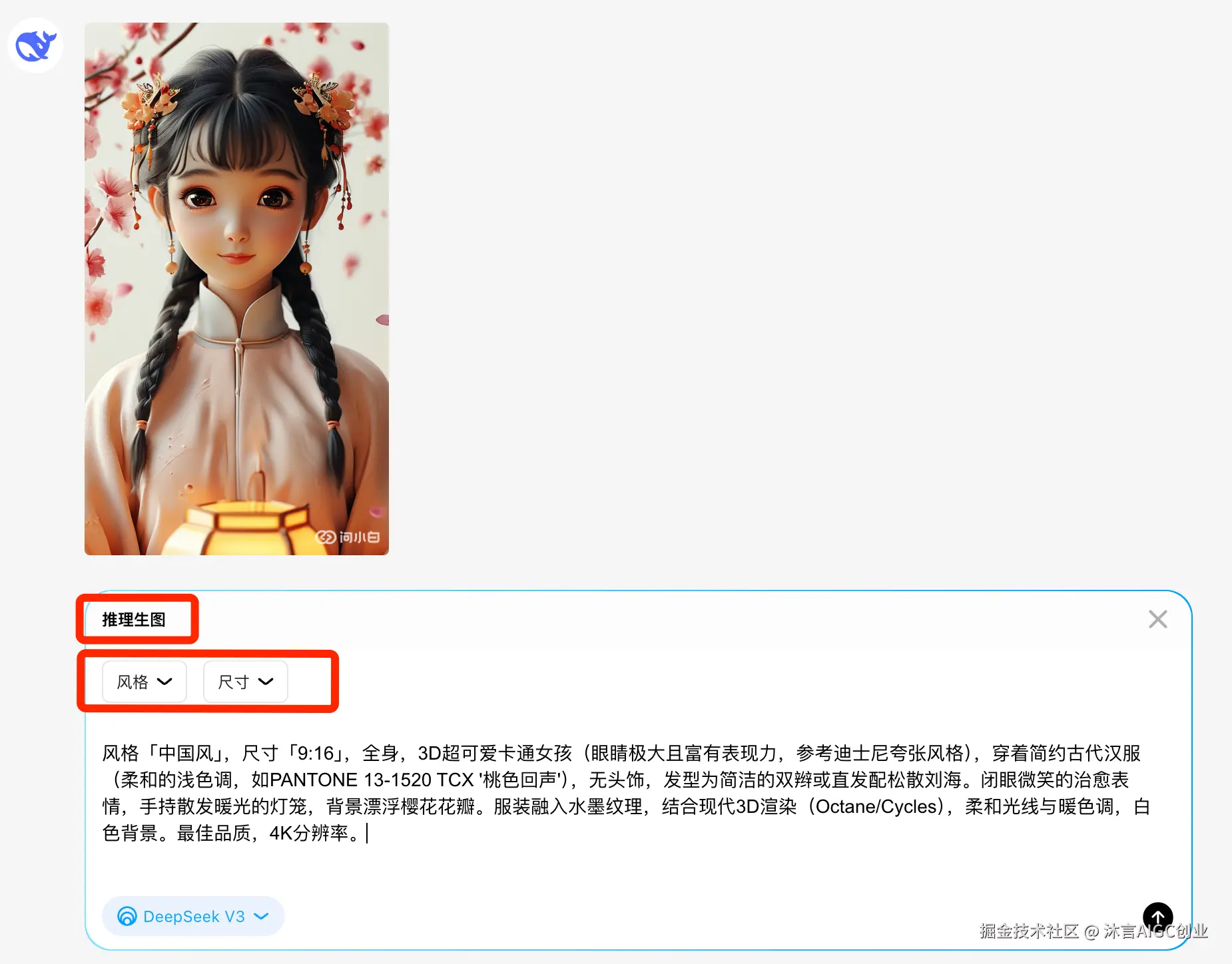 然后选择“推理生图”,把上面生成的提示词丢进去,选择风格和尺寸,就可以生成一张数字人图片。