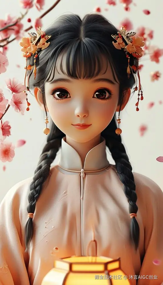 全身,3D超可爱卡通女孩(眼睛极大且富有表现力,参考迪士尼夸张风格),穿着简约古代汉服(柔和的浅色调,如PANTONE 13-1520 TCX '桃色回声'),无头饰,发型为简洁的双辫或直发配松散刘海。闭眼微笑的治愈表情,手持散发暖光的灯笼,背景漂浮樱花花瓣。服装融入水墨纹理,结合现代3D渲染(Octane/Cycles),柔和光线与暖色调,白色背景。最佳品质,4K分辨率。