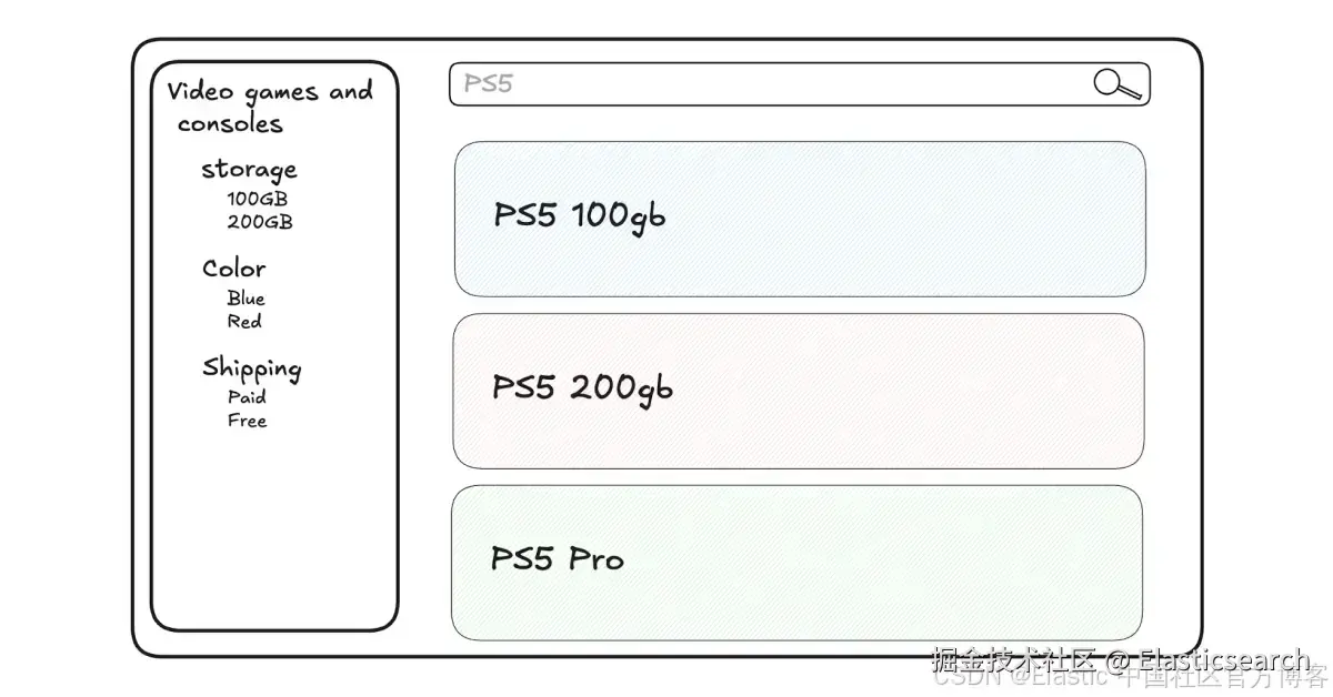 在开始之前,我们先来定义一下什么是筛选器和分类标签。筛选器是用于限制结果集的预定义属性。在一个在线市场中,例如,即使用户还没有进行搜索,筛选器也已经可用。用户可以在搜索“PS5”之前先选择一个类别,比如 “Video games - 电子游戏”,这样可以将搜索范围限定在一个更具体的子集,而不是整个数据库中。这大大提高了获得相关结果的几率。