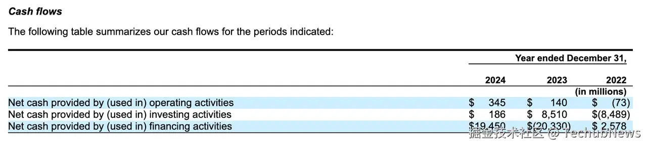 2024 年,Circle 通过经营活动获得的净现金为 3.45 亿美元,较 2023 年的 1.4 亿美元有所增加。主要原因是 USDC 流通余额的增加,以及平均收益率和平均储备存款的提升,导致储备中的现金收入增加了 1.425 亿美元,部分增长被分销和交易成本增加的 3230 万美元所抵消。此外,2022 年 Circle 在经营活动中使用了 7270 万美元的现金。