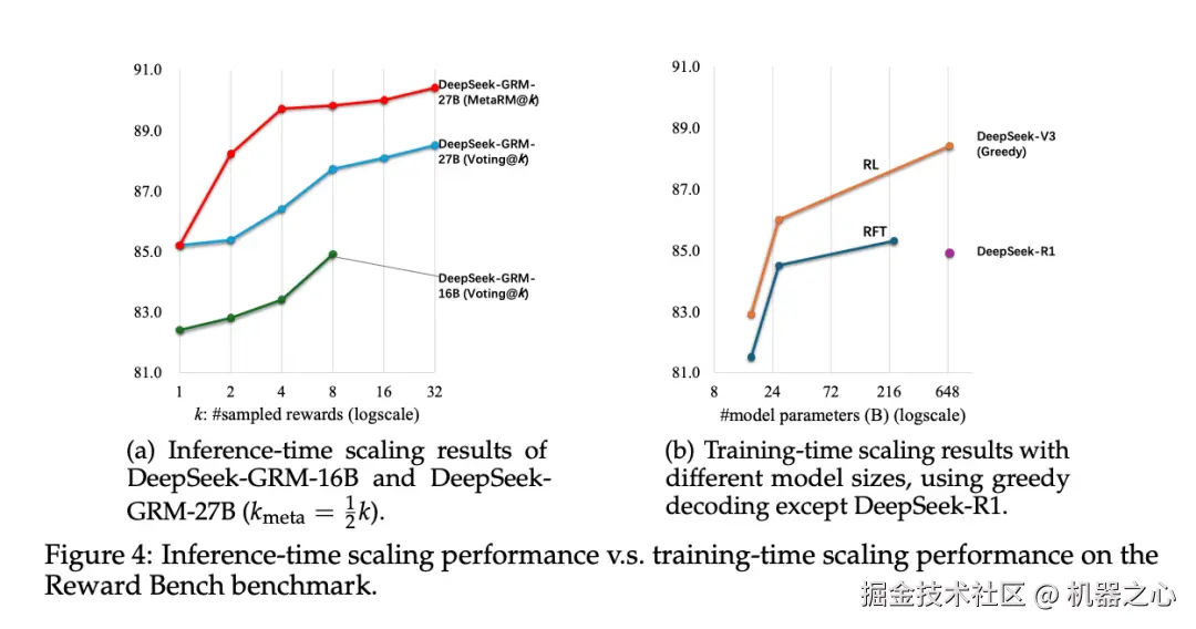 研究者们还进一步研究了 DeepSeek-GRM-27B 在推理阶段和训练阶段的扩展性能,通过在不同规模的 LLM 上进行后训练进行评估。所有模型均在 Reward Bench 上进行测试,结果如图 4 所示。