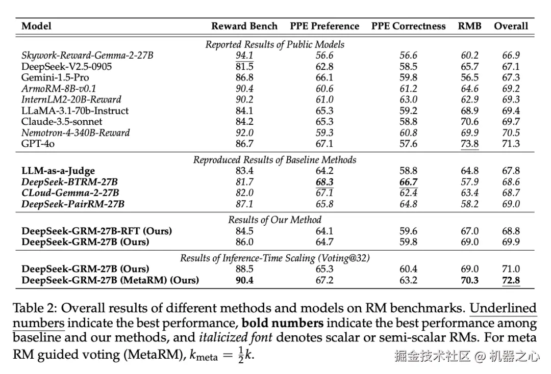 不同方法和模型在奖励模型基准测试上的整体结果如表 2 所示。