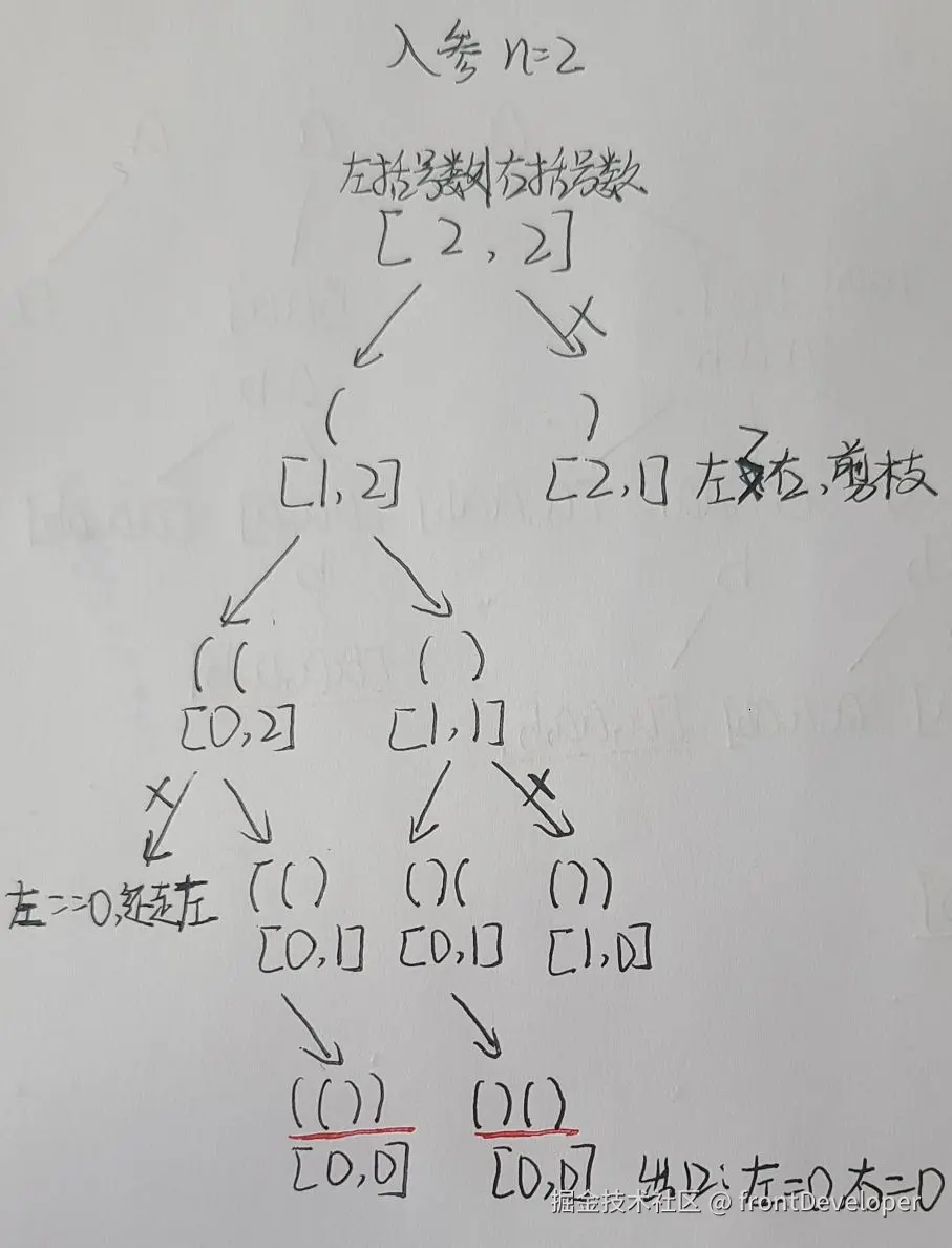 回溯函数的参数为一个二维数组:[剩余左括号数量,剩余右括号数量]。每次可做两种选择:选择左括号或选择右括号。剪枝条件为两个:1. left > right 说明path中右括号插入数量过多 、2. left == 0 && i==0 说明没有剩余左括号了,且依然想向path中插入左括号。