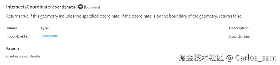 其中最关键的是第二步,我们要借助ol.geom.Geometry的intersectsCoordinate()方法来判断位置与图形是否相交。