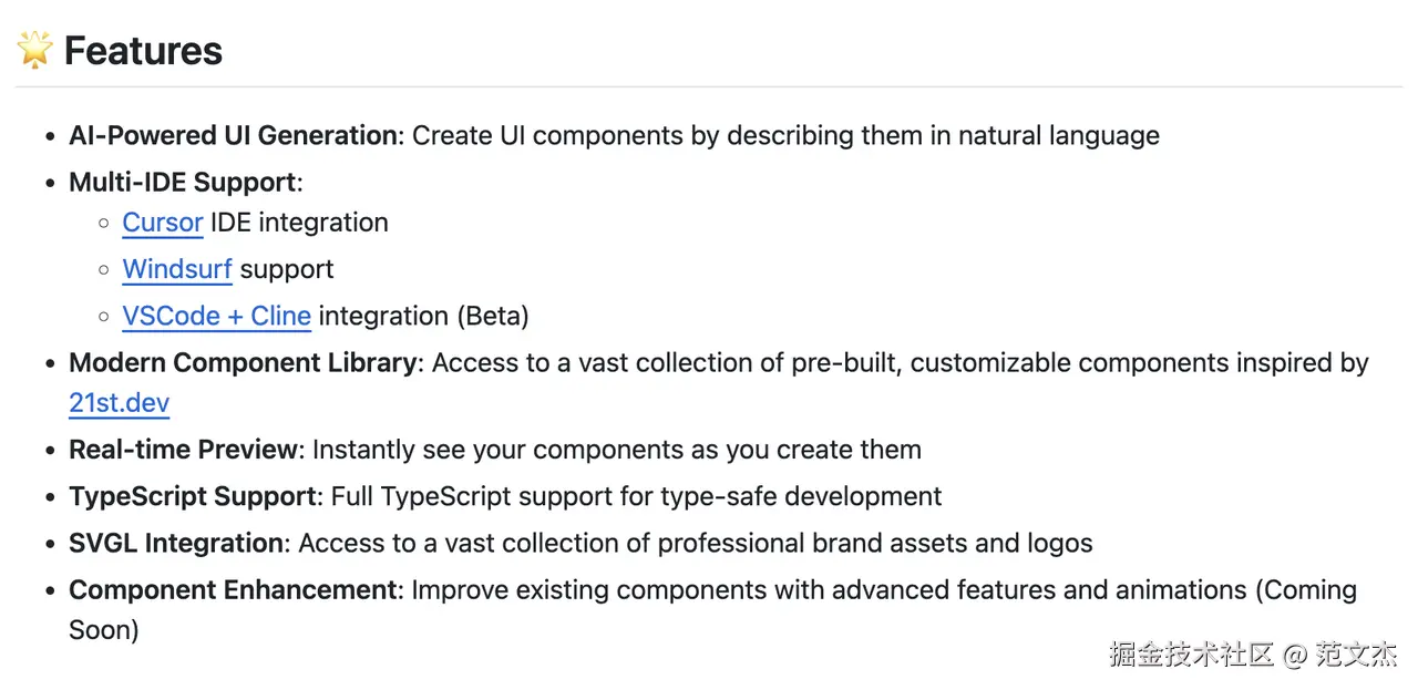 - 21st.dev 提供了一些 AI 友好的交互,一是为每一个共享组件都设置了用于生成组件代码的 Prompt,用户可直接复制粘贴到 LLM 工具中(推荐用 Cursor),即可生成对应组件代码;其次,它还提供了 MCP 实现,用户可将之接入到各类支持 MCP 协议的工具中;