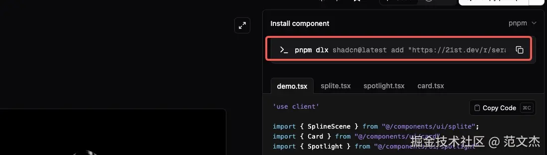 dlx工具:进入 21st.dev ,选定组件,进入组件详情页后,直接复制右上角的install component命令,之后在项目目录中执行,即可生成对应代码;