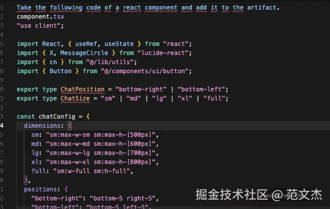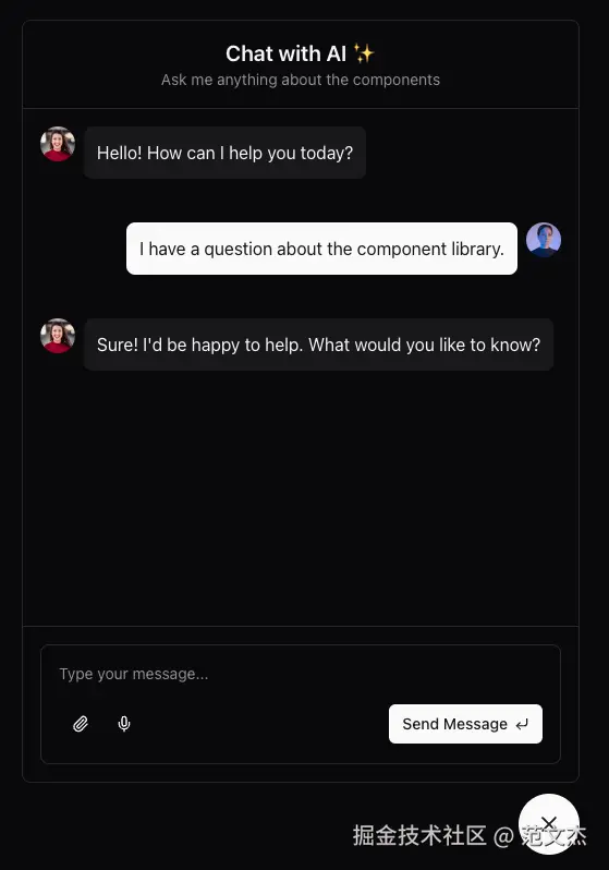 点击即可复制用于实现该组件的 Prompt,用户可将之粘贴到 Curosr 等工具中由 LLM 协助生成该组件的代码,例如用于实现 AI Chat 对话框的组件: