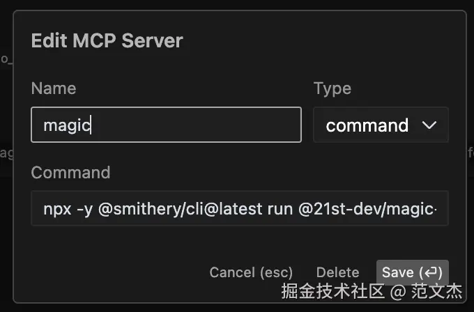 Command 中需要输入如下命令:npx -y @smithery/cli@latest run @21st-dev/magic-mcp --config "{"TWENTY_FIRST_API_KEY":"your-api-key"}" -