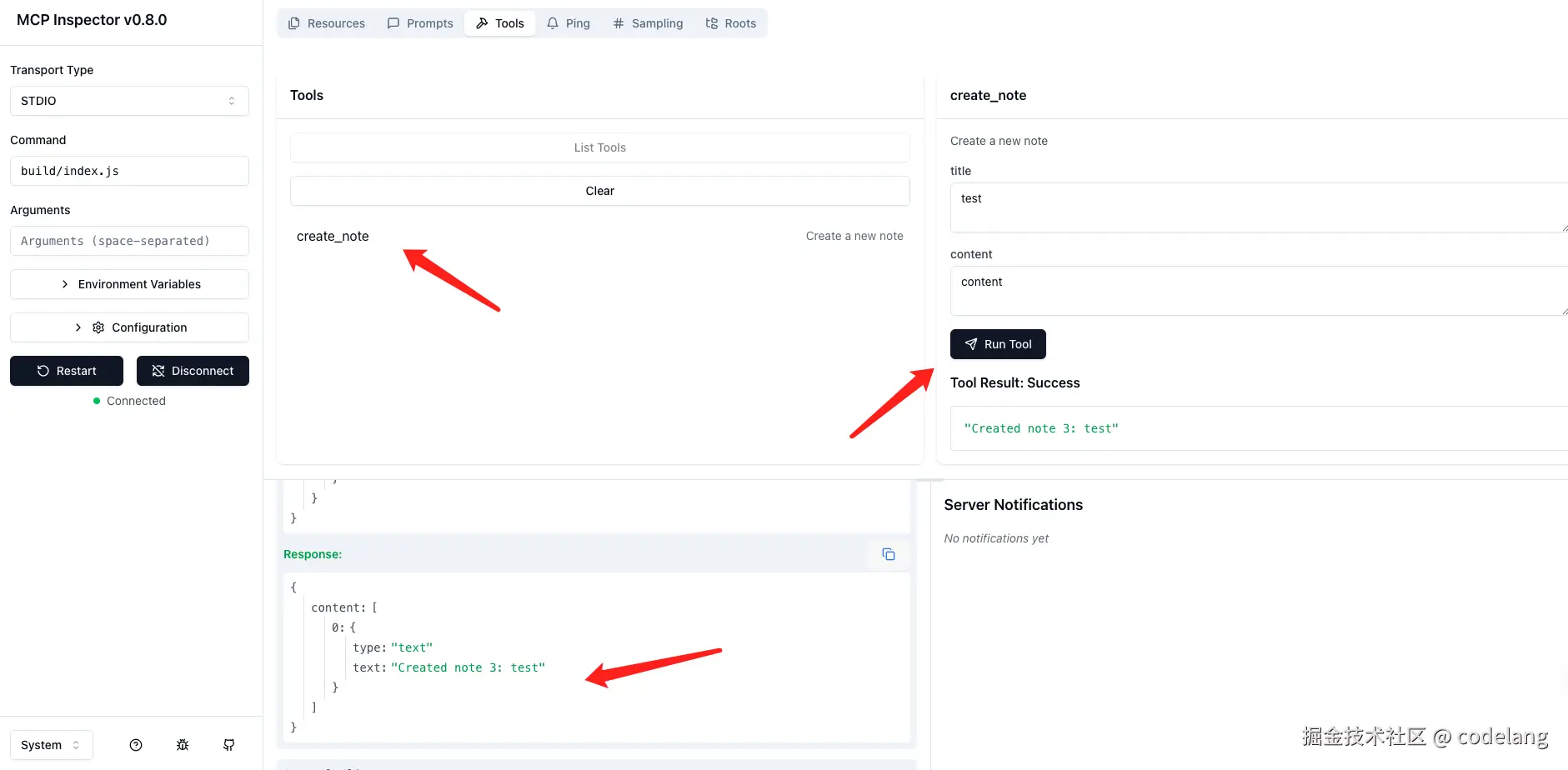MCP 服务器调试面板右侧主要用于请求 MCP 服务器内部定义的资源(Resources)、提示词(Prompts)、工具(Tools)等内容。我们可以在右侧的 Tools 栏目点 List Tools 获取 MCP 服务器内部实现的所有工具(Tools)。这里的 create_note是默认实现的 Tools,点击 Run Tool即可查看调试结果。