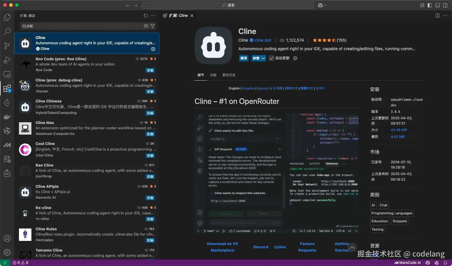 打开 VS Code,安装 Cline 插件: