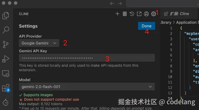 这里我使用的是 Gemini,申请 API Key 链接:aistudio.google.com/apikey,在 Cline 进行绑定: