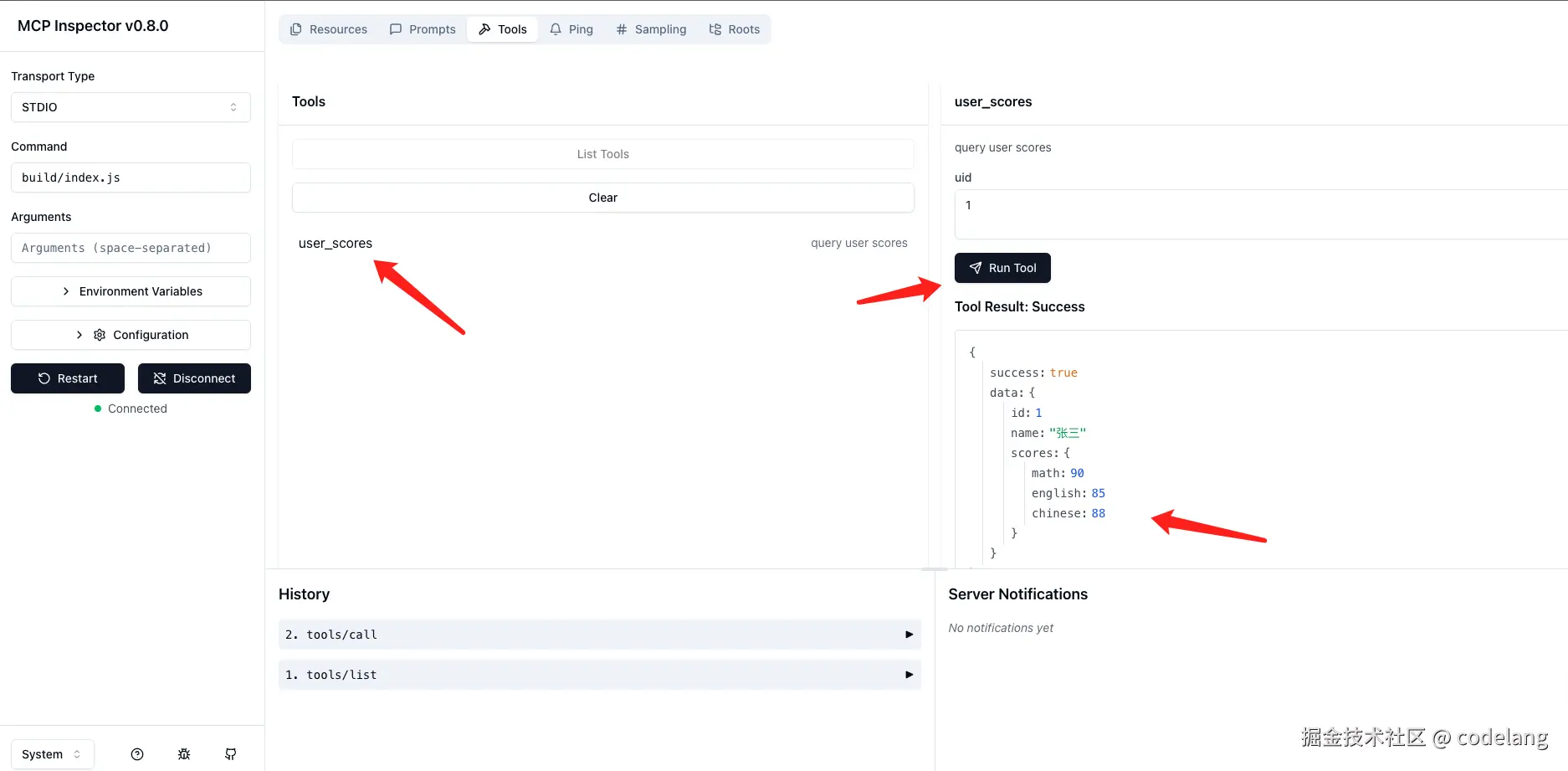 我们可以看到 List Tool 已经可以看到我们的 user_scores,我们来运行这个 Tool 看下效果: