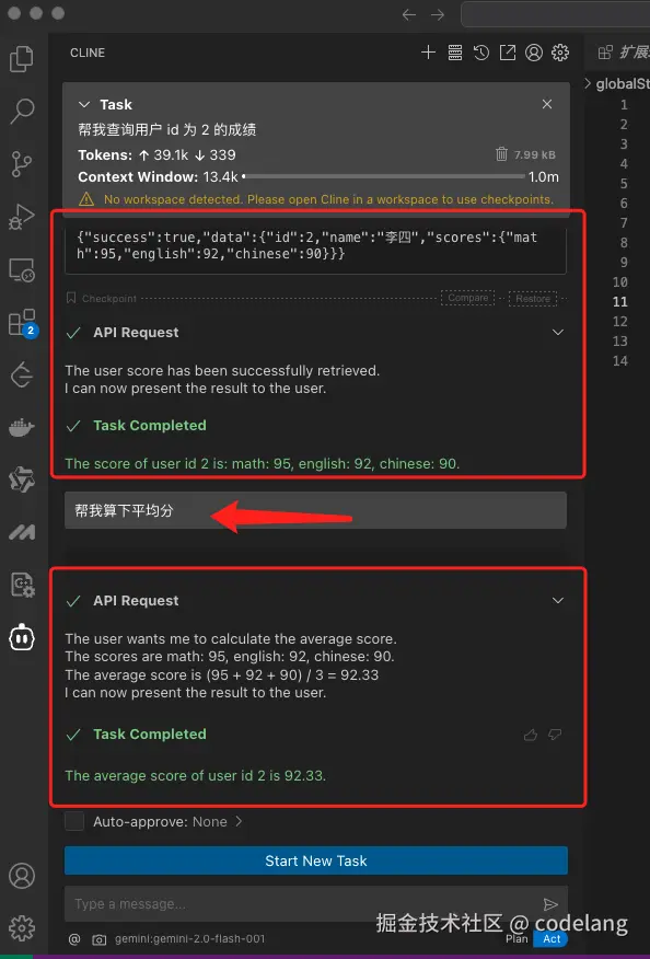 MCP 帮我们查询到了用户成绩,并且还做了整理的输出,然后继续输入提示词,帮我算下平均成绩,大模型也能继续进行计算输出。