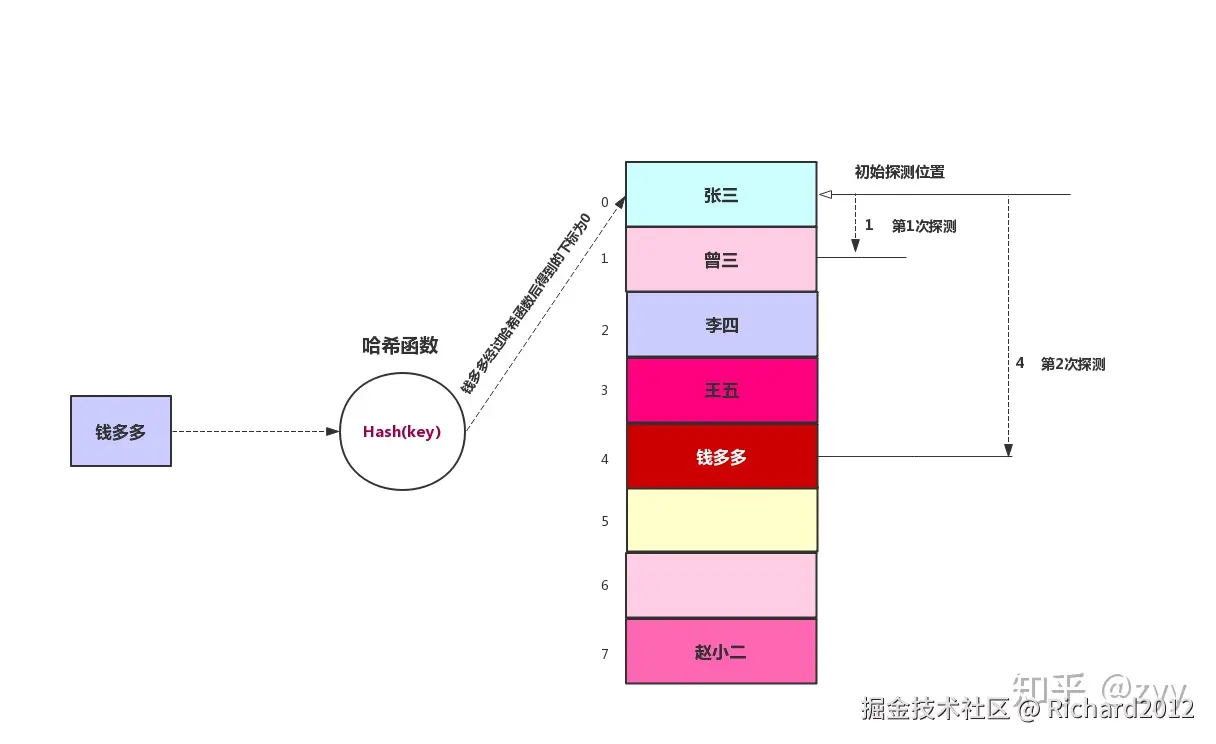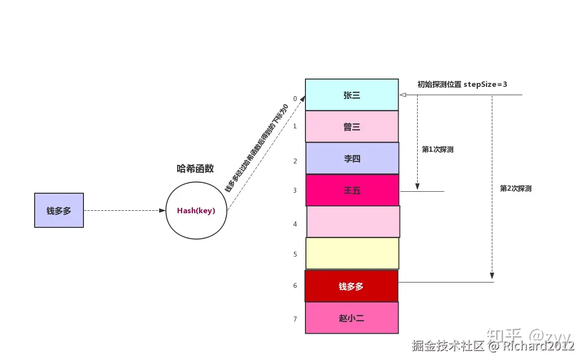 03、使用开放寻址法遍历哈希表,通过nextIndex(i, len)计算下一个索引以处理哈希冲突。