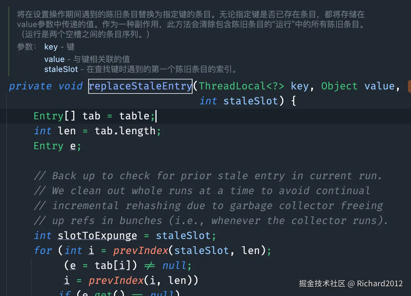 方法逻辑请看注释,新建的数组为原来数组长度的两倍,然后遍历旧数组中的 entry 并将其插入到新的数组中。注意,这段代码考虑得非常周全,在扩容的过程中,针对脏 entry 会把 value 设为 null,以便被垃圾回收,解决隐藏的内存泄漏问题。