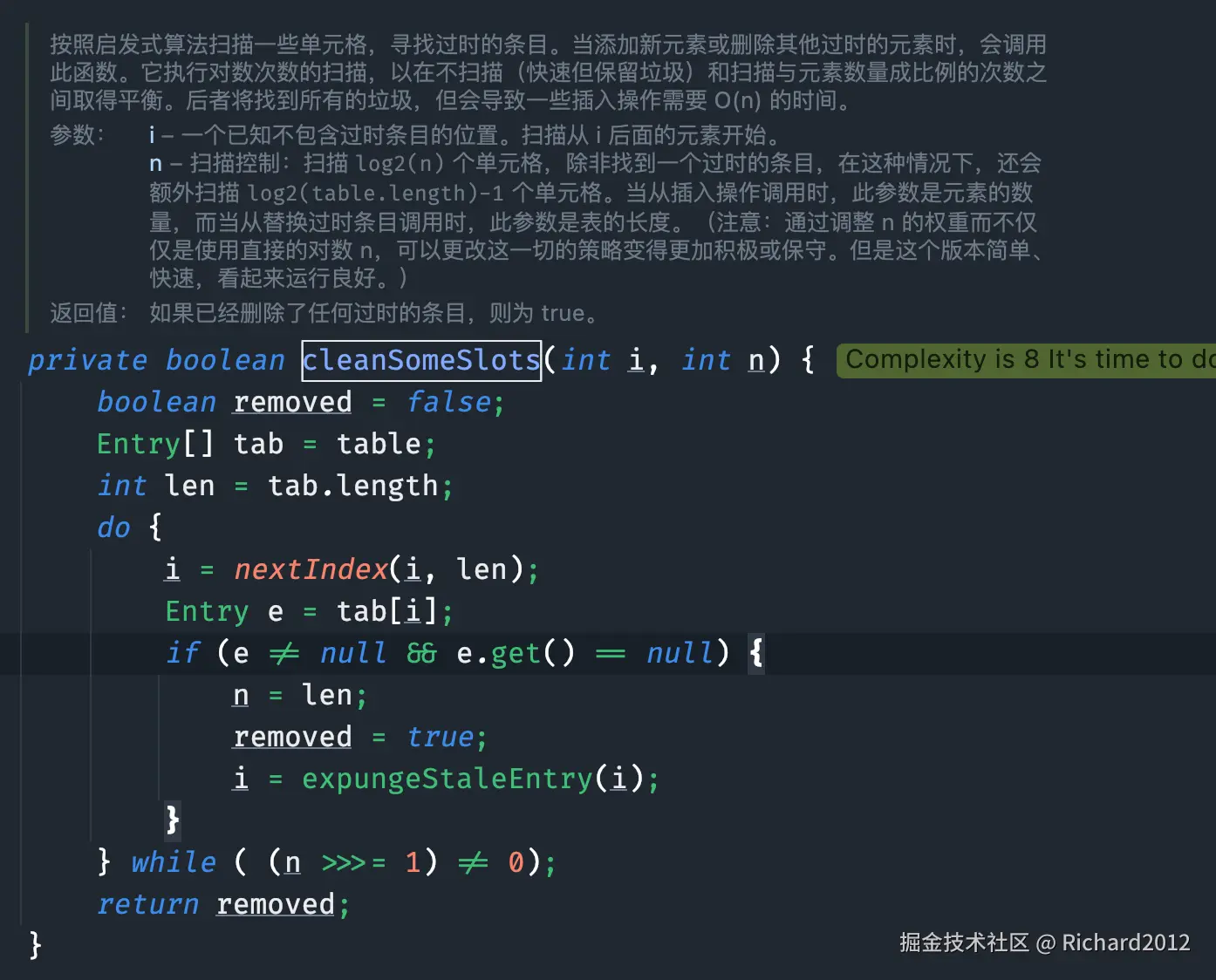 expungeStaleEntry(i)方法,清除该条目的值并对哈希表进行部分清理。该方法的目的是清除哈希表中的无效条目,即那些其键已被垃圾收集的条目。