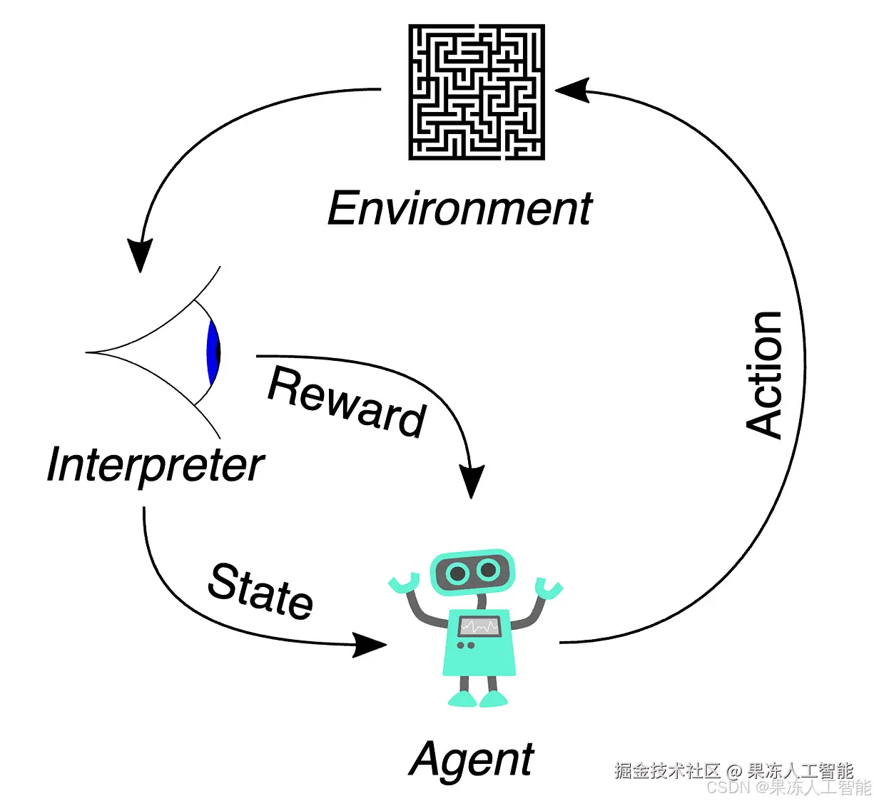 这就是强化学习的本质:有一个智能体(比如棋手模型),它感知环境(棋盘),采取行动(走棋),这些行动反过来又影响环境。它试图选择能最大化奖励的行动。行动表达为一组可能的下一步动作的概率分布。