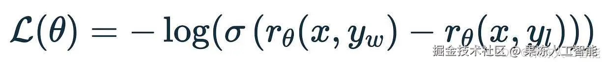 这个公式是从原始公式简化而来的,[7]但核心思想没变。这里,我们的输入是一个 prompt x,和一对输出 y_w(人类更喜欢的)和 y_l(人类不那么喜欢的)。r_θ 是奖励模型,它接收输出并返回一个得分。σ 是 sigmoid 函数。