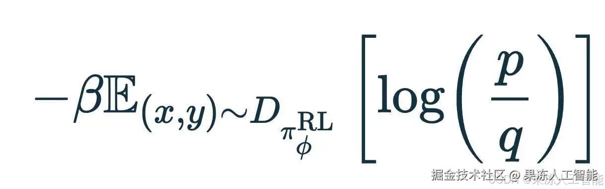 也就是说,我们对 log(p/q) 取期望,再乘一个常数 β。这个期望值其实就是 KL 散度(Kullback-Leibler divergence),表示两个分布的差异。通过加罚项,我们确保模型训练时不会离基础模型太远。