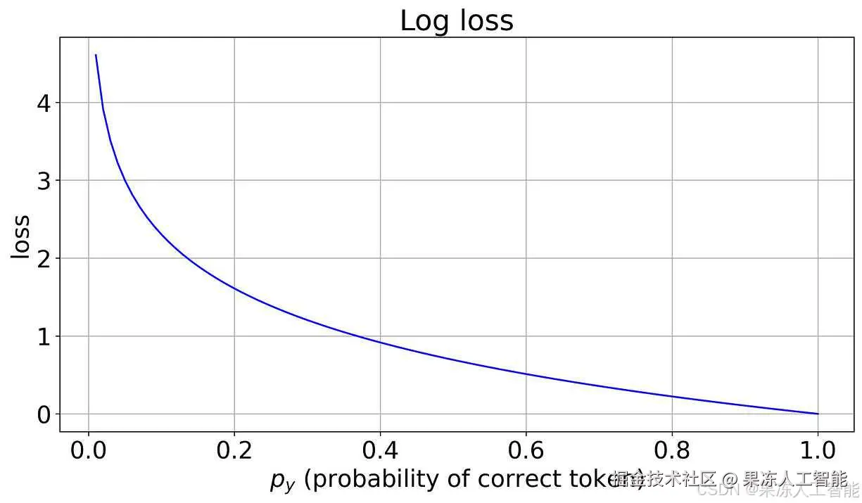 其中 p_y 是语言模型给出正确下一个 token 的概率。[2](这个公式是从通用的交叉熵公式简化过来的,但在语言建模这种特例下还是成立的。)所以,如果模型对实际的下一个 token 给出的概率是 1,那损失就是 0。要是模型觉得别的 token 更可能,损失就会变大。