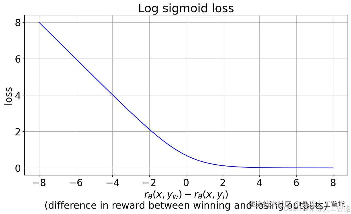 如果我们把损失函数画成图,横轴是 r_θ(x,y_w)−r_θ(x,y_l)(也就是赢的那个输出得分比输的高多少),会得到一条这样的曲线: