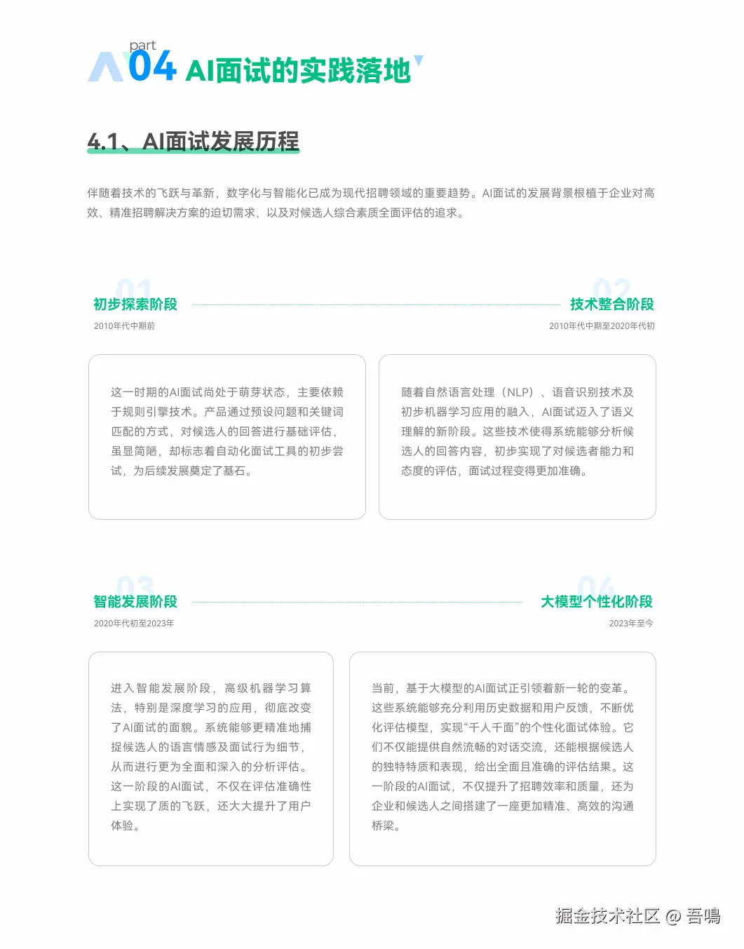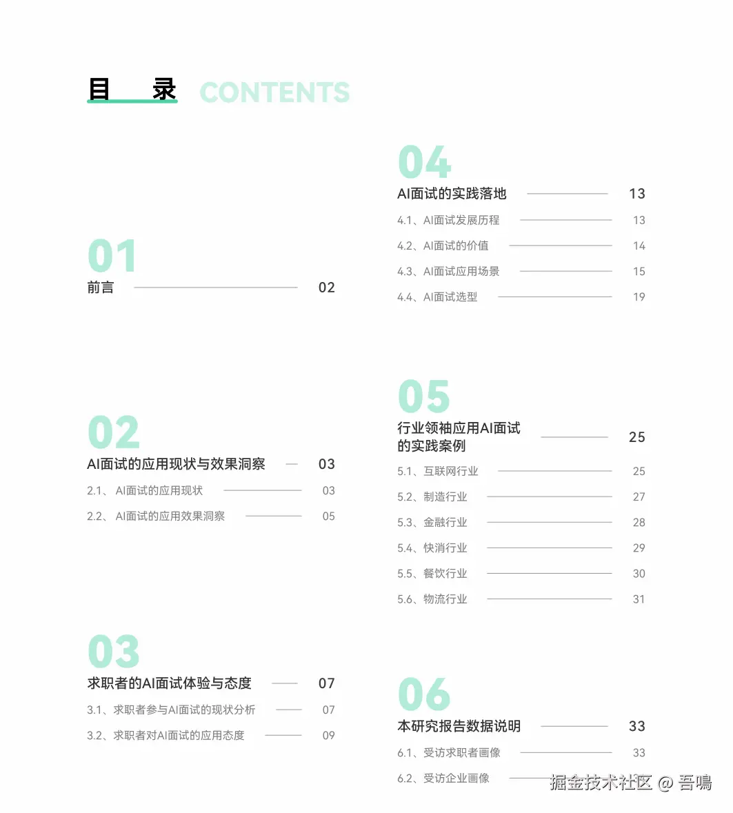 今天吾鳴要给大家分享一份由牛客网出品的关于AI大模型如何在面试中应用的实战手册,这份报告主要从AI面试的应用现状与效果洞察、求职者的AI面试体验与态度、AI面试实践落地以及大厂实践落地案例等方向进行展开介绍AI大模型如何赋能企业面试。报告一共39页,干货满满,文末附上完整版下载地址。