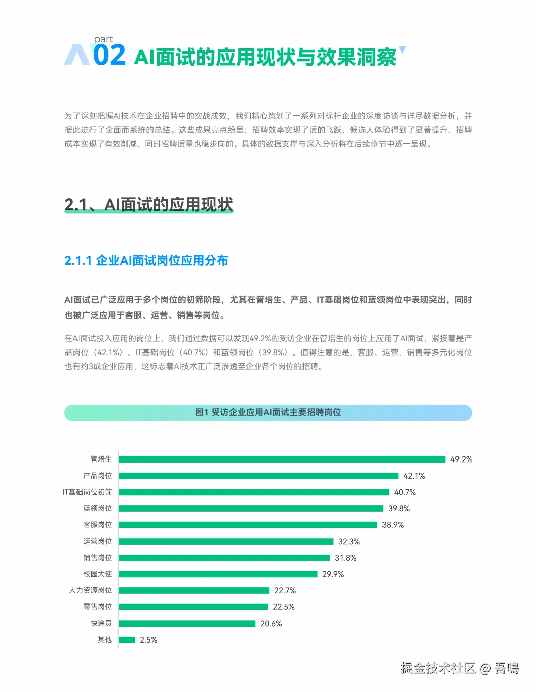 - 应用现状:AI面试已覆盖管培生(49.2%)、产品(42.1%)、IT基础岗位(40.7%)等,且适用于不同规模企业(从100人次到5000+人次)。