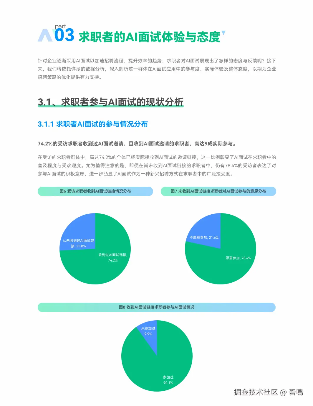- 参与情况:74.2%求职者收到过AI面试邀请,90.1%实际参与;互联网(64.7%)、智能制造(60.2%)为高频应用行业。