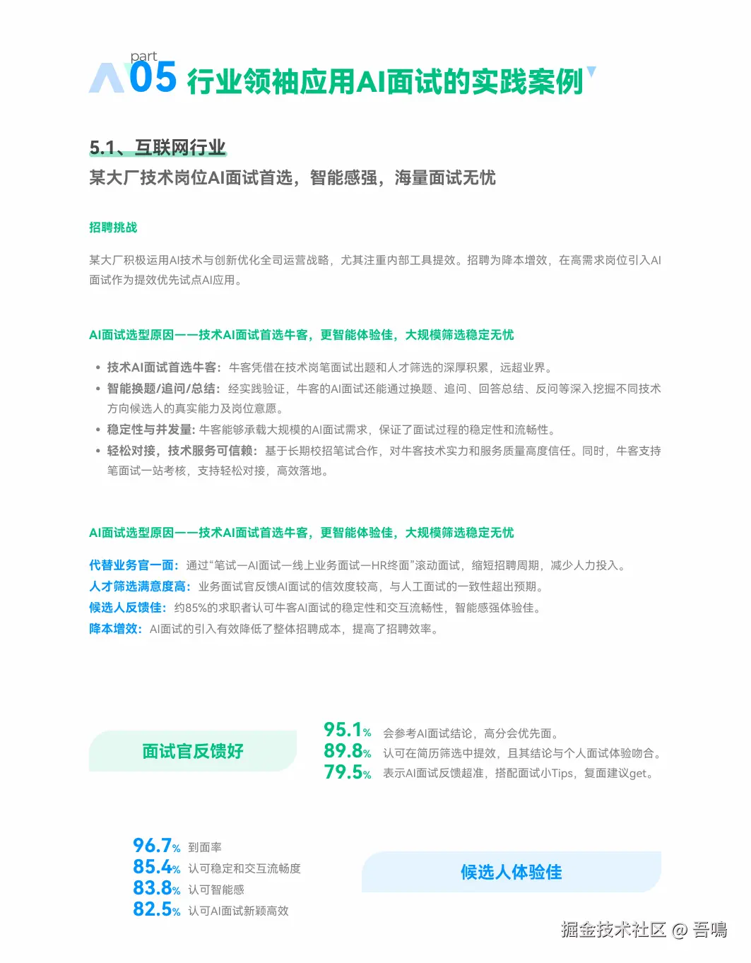 - 互联网大厂:技术岗AI面试节省人力,候选人满意度85%;
