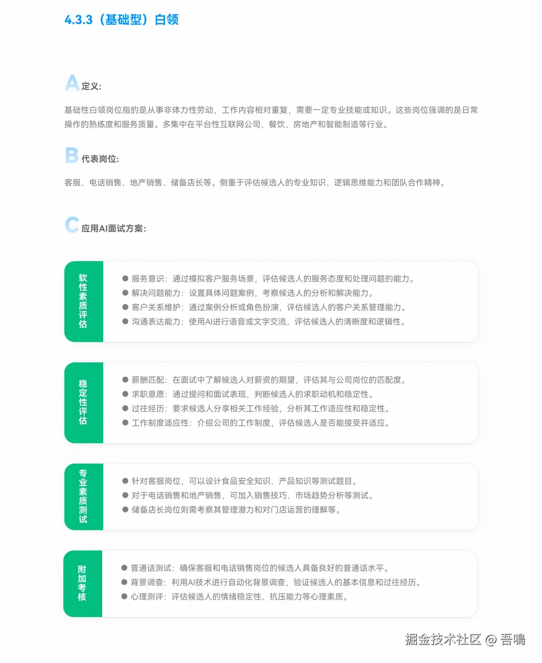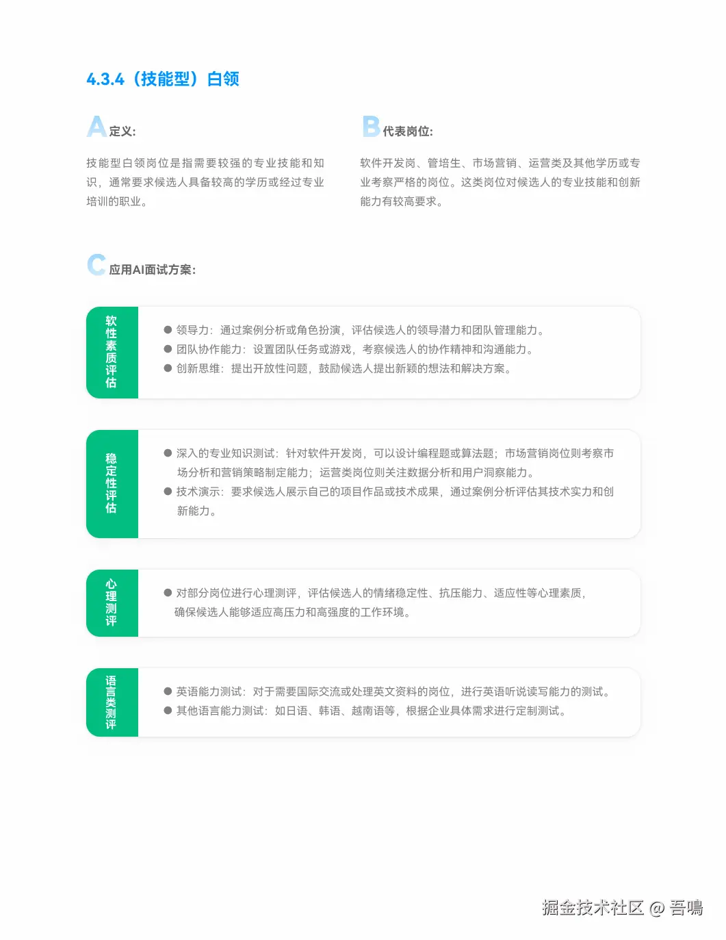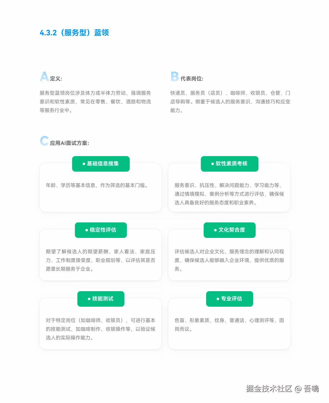 - 应用场景:覆盖蓝领(劳动型、服务型)和白领(基础型、技能型),针对不同岗位定制信息收集、技能测试、心理测评等方案。