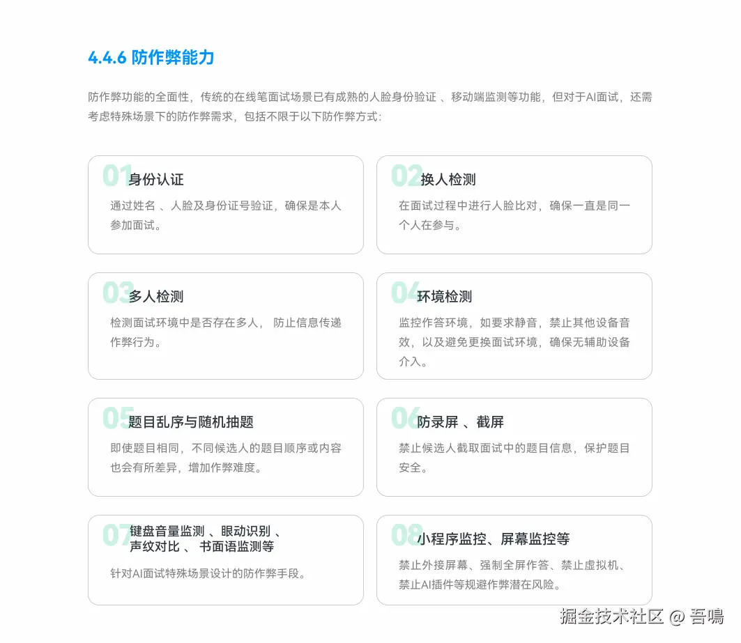 - 选型建议:需关注自研大模型能力、智能追问、多维考核(专业/心理/语言)、防作弊功能(身份/环境检测)、数据安全、定制交付能力等9大维度。