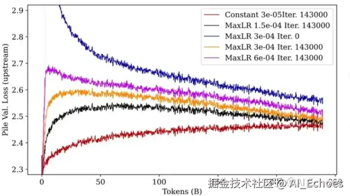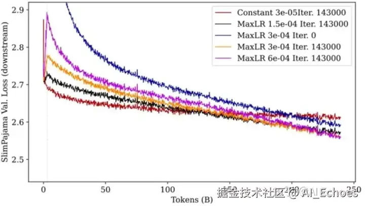 解释一下这里为什么这么关注训练前期,是因为在真实训练中,我们可能不一定会增强图中所示的 250B 这么多的 tokens,尤其是在模型参数很大的情况中。所以,当资源不允许充分训练的情况下,较小的学习率和较长的 warmup 步数可能是一个不错的选择。