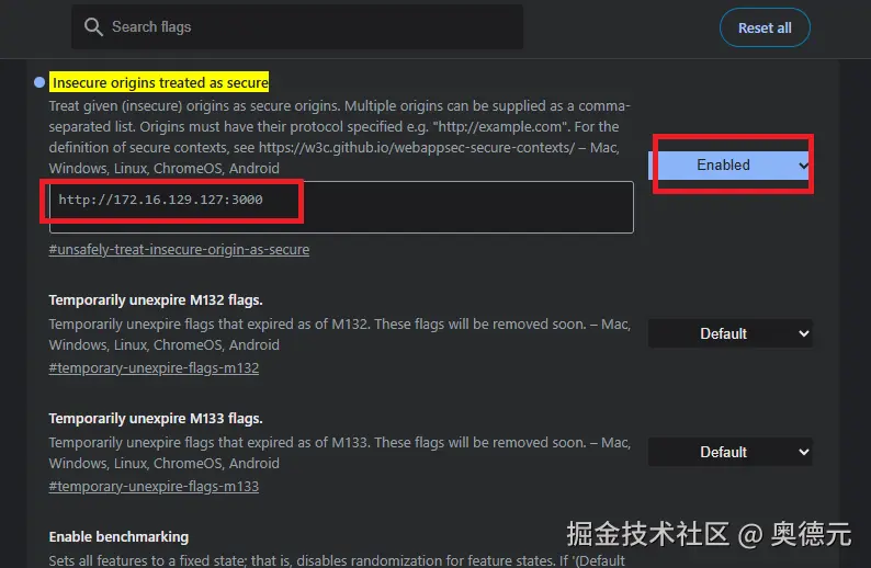 - 打开chrome: chrome://flags/#unsafely-treat-insecure-origin-as-secure
